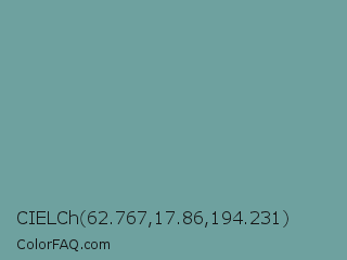 CIELCh 62.767,17.86,194.231 Color is a normal cyan color and the nearest color is Sea Nymph #78a39c. Hex code #6ea19f and RGB value is rgb(110,161,159). In RGB color space, this color is composed of 43% red, 63% green, 62% blue, In CMYK color space, this color is composed of 32% cyan, 0% magenta, 1% yellow , 37% black , In HSL color space, this color has a hue angle of 178° , 21% saturation and 53% lightness.