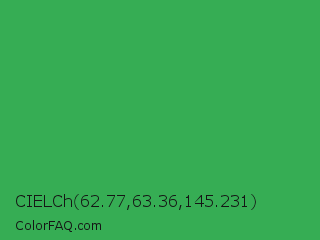 CIELCh 62.77,63.36,145.231 Color is a normal green color and the nearest color is Chateau Green #40a860. Hex code #36ad54 and RGB value is rgb(54,173,84). In RGB color space, this color is composed of 21% red, 68% green, 33% blue, In CMYK color space, this color is composed of 69% cyan, 0% magenta, 51% yellow , 32% black , In HSL color space, this color has a hue angle of 135° , 52% saturation and 45% lightness.