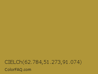 CIELCh 62.784,51.273,91.074 Color is a normal yellow color and the nearest color is Alpine #af8f2c. Hex code #b09638 and RGB value is rgb(176,150,56). In RGB color space, this color is composed of 69% red, 59% green, 22% blue, In CMYK color space, this color is composed of 0% cyan, 15% magenta, 68% yellow , 31% black , In HSL color space, this color has a hue angle of 47° , 52% saturation and 45% lightness.