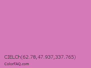 CIELCh 62.78,47.937,337.765 Color is a light magenta color and the nearest color is Middle Purple #d982b5. Hex code #d579b9 and RGB value is rgb(213,121,185). In RGB color space, this color is composed of 84% red, 47% green, 73% blue, In CMYK color space, this color is composed of 0% cyan, 43% magenta, 13% yellow , 16% black , In HSL color space, this color has a hue angle of 318° , 52% saturation and 65% lightness.