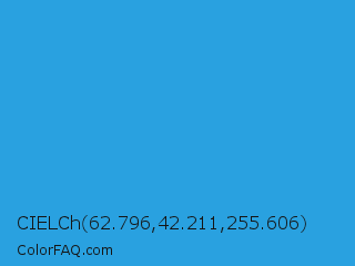 CIELCh 62.796,42.211,255.606 Color is a normal blue color and the nearest color is Button Blue #24a0ed. Hex code #29a1e0 and RGB value is rgb(41,161,224). In RGB color space, this color is composed of 16% red, 63% green, 88% blue, In CMYK color space, this color is composed of 82% cyan, 28% magenta, 0% yellow , 12% black , In HSL color space, this color has a hue angle of 201° , 75% saturation and 52% lightness.