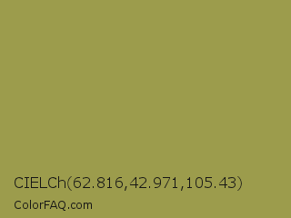 CIELCh 62.816,42.971,105.43 Color is a normal yellow color and the nearest color is Moss Green #8a9a5b. Hex code #9c9c4c and RGB value is rgb(156,156,76). In RGB color space, this color is composed of 61% red, 61% green, 30% blue, In CMYK color space, this color is composed of 0% cyan, 0% magenta, 51% yellow , 39% black , In HSL color space, this color has a hue angle of 60° , 34% saturation and 45% lightness.