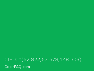 CIELCh 62.822,67.678,148.303 Color is a normal green color and the nearest color is Green Pigment #00a550. Hex code #09af55 and RGB value is rgb(9,175,85). In RGB color space, this color is composed of 4% red, 69% green, 33% blue, In CMYK color space, this color is composed of 95% cyan, 0% magenta, 51% yellow , 31% black , In HSL color space, this color has a hue angle of 147° , 90% saturation and 36% lightness.