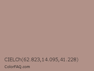 CIELCh 62.823,14.095,41.228 Color is a light red color and the nearest color is Grullo #a99a86. Hex code #b19188 and RGB value is rgb(177,145,136). In RGB color space, this color is composed of 69% red, 57% green, 53% blue, In CMYK color space, this color is composed of 0% cyan, 18% magenta, 23% yellow , 31% black , In HSL color space, this color has a hue angle of 13° , 21% saturation and 61% lightness.