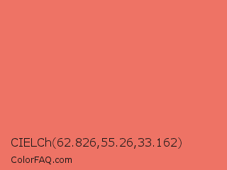 CIELCh 62.826,55.26,33.162 Color is a light red color and the nearest color is Terracotta #e2725b. Hex code #ee7365 and RGB value is rgb(238,115,101). In RGB color space, this color is composed of 93% red, 45% green, 40% blue, In CMYK color space, this color is composed of 0% cyan, 52% magenta, 58% yellow , 7% black , In HSL color space, this color has a hue angle of 6° , 80% saturation and 66% lightness.
