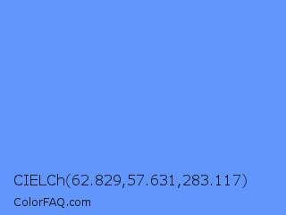 CIELCh 62.829,57.631,283.117 Color is a light blue color and the nearest color is Cornflower Blue #6495ed. Hex code #6196fc and RGB value is rgb(97,150,252). In RGB color space, this color is composed of 38% red, 59% green, 99% blue, In CMYK color space, this color is composed of 62% cyan, 40% magenta, 0% yellow , 1% black , In HSL color space, this color has a hue angle of 219° , 96% saturation and 68% lightness.