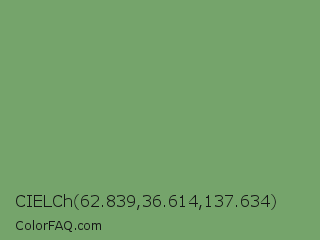 CIELCh 62.839,36.614,137.634 Color is a normal green color and the nearest color is Asparagus Green #7ba05b. Hex code #75a46b and RGB value is rgb(117,164,107). In RGB color space, this color is composed of 46% red, 64% green, 42% blue, In CMYK color space, this color is composed of 29% cyan, 0% magenta, 35% yellow , 36% black , In HSL color space, this color has a hue angle of 109° , 24% saturation and 53% lightness.