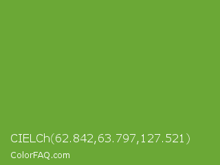 CIELCh 62.842,63.797,127.521 Color is a normal green color and the nearest color is Green RYB #66b032. Hex code #6ba836 and RGB value is rgb(107,168,54). In RGB color space, this color is composed of 42% red, 66% green, 21% blue, In CMYK color space, this color is composed of 36% cyan, 0% magenta, 68% yellow , 34% black , In HSL color space, this color has a hue angle of 92° , 51% saturation and 44% lightness.