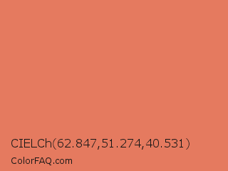 CIELCh 62.847,51.274,40.531 Color is a light red color and the nearest color is Terracotta #e2725b. Hex code #e57a5f and RGB value is rgb(229,122,95). In RGB color space, this color is composed of 90% red, 48% green, 37% blue, In CMYK color space, this color is composed of 0% cyan, 47% magenta, 59% yellow , 10% black , In HSL color space, this color has a hue angle of 12° , 72% saturation and 64% lightness.