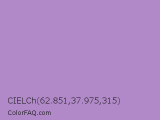 CIELCh 62.851,37.975,315 Color is a light purple color and the nearest color is East Side #ac91ce. Hex code #b189c8 and RGB value is rgb(177,137,200). In RGB color space, this color is composed of 69% red, 54% green, 78% blue, In CMYK color space, this color is composed of 12% cyan, 32% magenta, 0% yellow , 22% black , In HSL color space, this color has a hue angle of 278° , 36% saturation and 66% lightness.