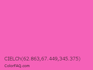 CIELCh 62.863,67.449,345.375 Color is a light magenta color and the nearest color is Hot Pink #ff69b4. Hex code #f561b8 and RGB value is rgb(245,97,184). In RGB color space, this color is composed of 96% red, 38% green, 72% blue, In CMYK color space, this color is composed of 0% cyan, 60% magenta, 25% yellow , 4% black , In HSL color space, this color has a hue angle of 325° , 88% saturation and 67% lightness.