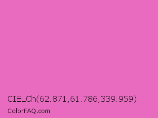 CIELCh 62.871,61.786,339.959 Color is a light magenta color and the nearest color is Persian Pink #f77fbe. Hex code #e86bbf and RGB value is rgb(232,107,191). In RGB color space, this color is composed of 91% red, 42% green, 75% blue, In CMYK color space, this color is composed of 0% cyan, 54% magenta, 18% yellow , 9% black , In HSL color space, this color has a hue angle of 320° , 73% saturation and 66% lightness.