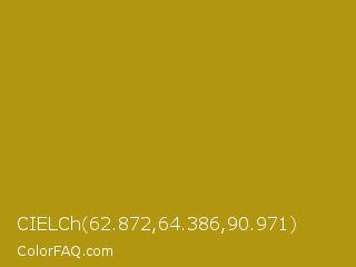 CIELCh 62.872,64.386,90.971 Color is a normal yellow color and the nearest color is Sahara #b7a214. Hex code #b39610 and RGB value is rgb(179,150,16). In RGB color space, this color is composed of 70% red, 59% green, 6% blue, In CMYK color space, this color is composed of 0% cyan, 16% magenta, 91% yellow , 30% black , In HSL color space, this color has a hue angle of 49° , 84% saturation and 38% lightness.