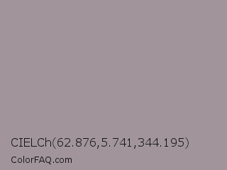 CIELCh 62.876,5.741,344.195 Color is a light rose color and the nearest color is Dusty Gray #a8989b. Hex code #a1959b and RGB value is rgb(161,149,155). In RGB color space, this color is composed of 63% red, 58% green, 61% blue, In CMYK color space, this color is composed of 0% cyan, 7% magenta, 4% yellow , 37% black , In HSL color space, this color has a hue angle of 330° , 6% saturation and 61% lightness.