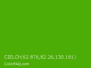 CIELCh 62.876,82.26,130.161 Color is a normal green color and the nearest color is Kelly Green #4cbb17. Hex code #4cad07 and RGB value is rgb(76,173,7). In RGB color space, this color is composed of 30% red, 68% green, 3% blue, In CMYK color space, this color is composed of 56% cyan, 0% magenta, 96% yellow , 32% black , In HSL color space, this color has a hue angle of 95° , 92% saturation and 35% lightness.