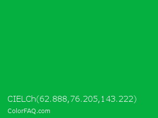 CIELCh 62.888,76.205,143.222 Color is a normal green color and the nearest color is Green Pantone #00ad43. Hex code #05b040 and RGB value is rgb(5,176,64). In RGB color space, this color is composed of 2% red, 69% green, 25% blue, In CMYK color space, this color is composed of 97% cyan, 0% magenta, 64% yellow , 31% black , In HSL color space, this color has a hue angle of 141° , 94% saturation and 35% lightness.