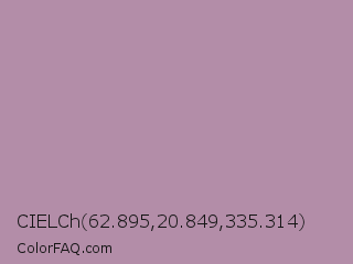 CIELCh 62.895,20.849,335.314 Color is a light magenta color and the nearest color is Opera Mauve #b784a7. Hex code #b38da8 and RGB value is rgb(179,141,168). In RGB color space, this color is composed of 70% red, 55% green, 66% blue, In CMYK color space, this color is composed of 0% cyan, 21% magenta, 6% yellow , 30% black , In HSL color space, this color has a hue angle of 317° , 20% saturation and 63% lightness.