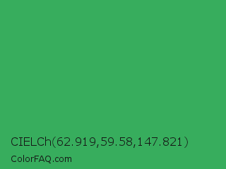 CIELCh 62.919,59.58,147.821 Color is a normal green color and the nearest color is Chateau Green #40a860. Hex code #37ad5d and RGB value is rgb(55,173,93). In RGB color space, this color is composed of 22% red, 68% green, 36% blue, In CMYK color space, this color is composed of 68% cyan, 0% magenta, 46% yellow , 32% black , In HSL color space, this color has a hue angle of 139° , 52% saturation and 45% lightness.