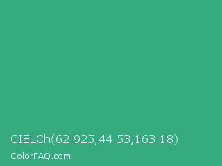 CIELCh 62.925,44.53,163.18 Color is a normal green color and the nearest color is Ocean Green #41aa78. Hex code #37ab80 and RGB value is rgb(55,171,128). In RGB color space, this color is composed of 22% red, 67% green, 50% blue, In CMYK color space, this color is composed of 68% cyan, 0% magenta, 25% yellow , 33% black , In HSL color space, this color has a hue angle of 158° , 51% saturation and 44% lightness.