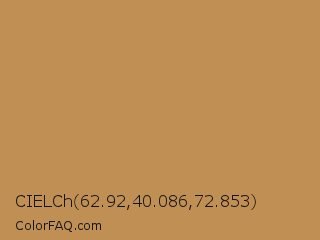 CIELCh 62.92,40.086,72.853 Color is a normal orange color and the nearest color is Aztec Gold #c39953. Hex code #c08f54 and RGB value is rgb(192,143,84). In RGB color space, this color is composed of 75% red, 56% green, 33% blue, In CMYK color space, this color is composed of 0% cyan, 26% magenta, 56% yellow , 25% black , In HSL color space, this color has a hue angle of 33° , 46% saturation and 54% lightness.