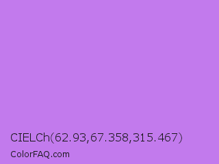 CIELCh 62.93,67.358,315.467 Color is a light purple color and the nearest color is Lavender #b57edc. Hex code #c27aed and RGB value is rgb(194,122,237). In RGB color space, this color is composed of 76% red, 48% green, 93% blue, In CMYK color space, this color is composed of 18% cyan, 49% magenta, 0% yellow , 7% black , In HSL color space, this color has a hue angle of 278° , 76% saturation and 70% lightness.