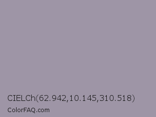 CIELCh 62.942,10.145,310.518 Color is a light purple color and the nearest color is Manatee #979aaa. Hex code #9e95a6 and RGB value is rgb(158,149,166). In RGB color space, this color is composed of 62% red, 58% green, 65% blue, In CMYK color space, this color is composed of 5% cyan, 10% magenta, 0% yellow , 35% black , In HSL color space, this color has a hue angle of 272° , 9% saturation and 62% lightness.