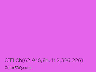 CIELCh 62.946,81.412,326.226 Color is a light magenta color and the nearest color is Orchid #da70d6. Hex code #e563ea and RGB value is rgb(229,99,234). In RGB color space, this color is composed of 90% red, 39% green, 92% blue, In CMYK color space, this color is composed of 2% cyan, 58% magenta, 0% yellow , 8% black , In HSL color space, this color has a hue angle of 298° , 76% saturation and 65% lightness.