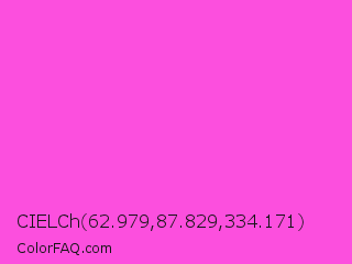 CIELCh 62.979,87.829,334.171 Color is a light magenta color and the nearest color is Purple Pizzazz #fe4eda. Hex code #fc4fde and RGB value is rgb(252,79,222). In RGB color space, this color is composed of 99% red, 31% green, 87% blue, In CMYK color space, this color is composed of 0% cyan, 69% magenta, 12% yellow , 1% black , In HSL color space, this color has a hue angle of 310° , 97% saturation and 65% lightness.