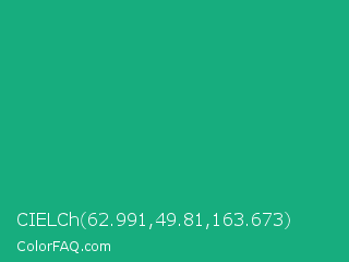 CIELCh 62.991,49.81,163.673 Color is a normal green color and the nearest color is Green Crayola #1cac78. Hex code #17ad7e and RGB value is rgb(23,173,126). In RGB color space, this color is composed of 9% red, 68% green, 49% blue, In CMYK color space, this color is composed of 87% cyan, 0% magenta, 27% yellow , 32% black , In HSL color space, this color has a hue angle of 161° , 77% saturation and 38% lightness.