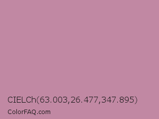 CIELCh 63.003,26.477,347.895 Color is a light rose color and the nearest color is Opera Mauve #b784a7. Hex code #c188a3 and RGB value is rgb(193,136,163). In RGB color space, this color is composed of 76% red, 53% green, 64% blue, In CMYK color space, this color is composed of 0% cyan, 30% magenta, 16% yellow , 24% black , In HSL color space, this color has a hue angle of 332° , 31% saturation and 65% lightness.