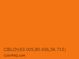 CIELCh 63.005,80.656,56.715 Color is a normal orange color and the nearest color is Ecstasy #fa7814. Hex code #f37413 and RGB value is rgb(243,116,19). In RGB color space, this color is composed of 95% red, 45% green, 7% blue, In CMYK color space, this color is composed of 0% cyan, 52% magenta, 92% yellow , 5% black , In HSL color space, this color has a hue angle of 26° , 90% saturation and 51% lightness.