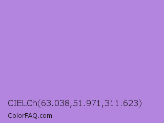 CIELCh 63.038,51.971,311.623 Color is a light purple color and the nearest color is Lavender #b57edc. Hex code #b385de and RGB value is rgb(179,133,222). In RGB color space, this color is composed of 70% red, 52% green, 87% blue, In CMYK color space, this color is composed of 19% cyan, 40% magenta, 0% yellow , 13% black , In HSL color space, this color has a hue angle of 271° , 57% saturation and 70% lightness.