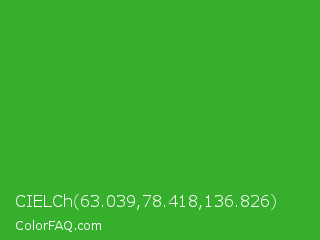CIELCh 63.039,78.418,136.826 Color is a normal green color and the nearest color is Wageningen Green #34b233. Hex code #36af2d and RGB value is rgb(54,175,45). In RGB color space, this color is composed of 21% red, 69% green, 18% blue, In CMYK color space, this color is composed of 69% cyan, 0% magenta, 74% yellow , 31% black , In HSL color space, this color has a hue angle of 116° , 59% saturation and 43% lightness.