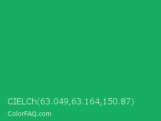 CIELCh 63.049,63.164,150.87 Color is a normal green color and the nearest color is GO Green #00ab66. Hex code #15af5f and RGB value is rgb(21,175,95). In RGB color space, this color is composed of 8% red, 69% green, 37% blue, In CMYK color space, this color is composed of 88% cyan, 0% magenta, 46% yellow , 31% black , In HSL color space, this color has a hue angle of 149° , 79% saturation and 38% lightness.