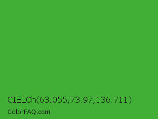 CIELCh 63.055,73.97,136.711 Color is a normal green color and the nearest color is Wageningen Green #34b233. Hex code #41ae35 and RGB value is rgb(65,174,53). In RGB color space, this color is composed of 25% red, 68% green, 21% blue, In CMYK color space, this color is composed of 63% cyan, 0% magenta, 70% yellow , 32% black , In HSL color space, this color has a hue angle of 114° , 53% saturation and 45% lightness.