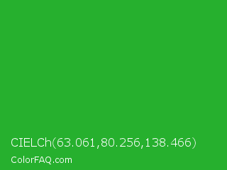 CIELCh 63.061,80.256,138.466 Color is a normal green color and the nearest color is Wageningen Green #34b233. Hex code #26b02e and RGB value is rgb(38,176,46). In RGB color space, this color is composed of 15% red, 69% green, 18% blue, In CMYK color space, this color is composed of 78% cyan, 0% magenta, 74% yellow , 31% black , In HSL color space, this color has a hue angle of 123° , 64% saturation and 42% lightness.