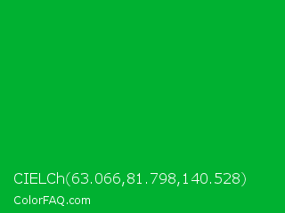 CIELCh 63.066,81.798,140.528 Color is a normal green color and the nearest color is Green Pantone #00ad43. Hex code #00b131 and RGB value is rgb(0,177,49). In RGB color space, this color is composed of 0% red, 69% green, 19% blue, In CMYK color space, this color is composed of 100% cyan, 0% magenta, 72% yellow , 31% black , In HSL color space, this color has a hue angle of 137° , 100% saturation and 35% lightness.