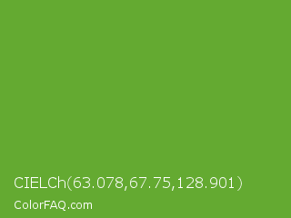 CIELCh 63.078,67.75,128.901 Color is a normal green color and the nearest color is Green RYB #66b032. Hex code #64aa31 and RGB value is rgb(100,170,49). In RGB color space, this color is composed of 39% red, 67% green, 19% blue, In CMYK color space, this color is composed of 41% cyan, 0% magenta, 71% yellow , 33% black , In HSL color space, this color has a hue angle of 95° , 55% saturation and 43% lightness.
