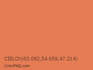 CIELCh 63.092,54.659,47.214 Color is a light orange color and the nearest color is Burnt Sienna #e97451. Hex code #e57c53 and RGB value is rgb(229,124,83). In RGB color space, this color is composed of 90% red, 49% green, 33% blue, In CMYK color space, this color is composed of 0% cyan, 46% magenta, 64% yellow , 10% black , In HSL color space, this color has a hue angle of 17° , 74% saturation and 61% lightness.