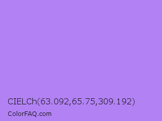 CIELCh 63.092,65.75,309.192 Color is a light violet color and the nearest color is Lavender #b57edc. Hex code #b281f4 and RGB value is rgb(178,129,244). In RGB color space, this color is composed of 70% red, 51% green, 96% blue, In CMYK color space, this color is composed of 27% cyan, 47% magenta, 0% yellow , 4% black , In HSL color space, this color has a hue angle of 266° , 84% saturation and 73% lightness.