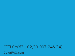 CIELCh 63.102,39.907,246.34 Color is a normal blue color and the nearest color is Battery Charged Blue #1dacd6. Hex code #14a4d9 and RGB value is rgb(20,164,217). In RGB color space, this color is composed of 8% red, 64% green, 85% blue, In CMYK color space, this color is composed of 91% cyan, 24% magenta, 0% yellow , 15% black , In HSL color space, this color has a hue angle of 196° , 83% saturation and 46% lightness.