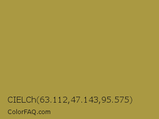 CIELCh 63.112,47.143,95.575 Color is a normal yellow color and the nearest color is Brass #b5a642. Hex code #aa9942 and RGB value is rgb(170,153,66). In RGB color space, this color is composed of 67% red, 60% green, 26% blue, In CMYK color space, this color is composed of 0% cyan, 10% magenta, 61% yellow , 33% black , In HSL color space, this color has a hue angle of 50° , 44% saturation and 46% lightness.
