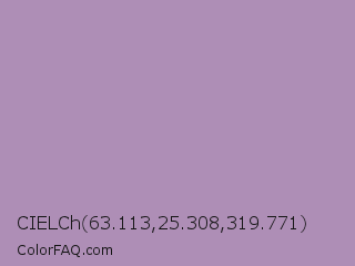 CIELCh 63.113,25.308,319.771 Color is a light purple color and the nearest color is Glossy Grape #ab92b3. Hex code #ae8eb6 and RGB value is rgb(174,142,182). In RGB color space, this color is composed of 68% red, 56% green, 71% blue, In CMYK color space, this color is composed of 4% cyan, 22% magenta, 0% yellow , 29% black , In HSL color space, this color has a hue angle of 288° , 22% saturation and 64% lightness.