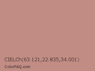 CIELCh 63.121,22.835,34.001 Color is a light red color and the nearest color is Brandy Rose #bb8983. Hex code #c18c83 and RGB value is rgb(193,140,131). In RGB color space, this color is composed of 76% red, 55% green, 51% blue, In CMYK color space, this color is composed of 0% cyan, 27% magenta, 32% yellow , 24% black , In HSL color space, this color has a hue angle of 9° , 33% saturation and 64% lightness.