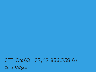 CIELCh 63.127,42.856,258.6 Color is a normal blue color and the nearest color is Button Blue #24a0ed. Hex code #33a1e3 and RGB value is rgb(51,161,227). In RGB color space, this color is composed of 20% red, 63% green, 89% blue, In CMYK color space, this color is composed of 78% cyan, 29% magenta, 0% yellow , 11% black , In HSL color space, this color has a hue angle of 203° , 76% saturation and 55% lightness.