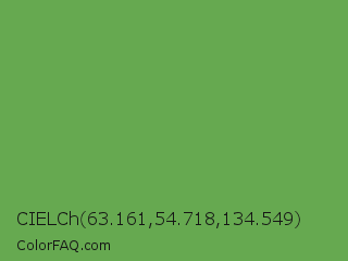 CIELCh 63.161,54.718,134.549 Color is a normal green color and the nearest color is Palm Leaf #6f9940. Hex code #66a950 and RGB value is rgb(102,169,80). In RGB color space, this color is composed of 40% red, 66% green, 31% blue, In CMYK color space, this color is composed of 40% cyan, 0% magenta, 53% yellow , 34% black , In HSL color space, this color has a hue angle of 105° , 36% saturation and 49% lightness.
