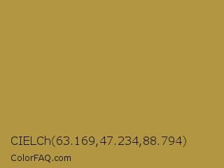 CIELCh 63.169,47.234,88.794 Color is a normal orange color and the nearest color is Brass #b5a642. Hex code #b39642 and RGB value is rgb(179,150,66). In RGB color space, this color is composed of 70% red, 59% green, 26% blue, In CMYK color space, this color is composed of 0% cyan, 16% magenta, 63% yellow , 30% black , In HSL color space, this color has a hue angle of 45° , 46% saturation and 48% lightness.