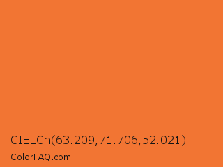 CIELCh 63.209,71.706,52.021 Color is a normal orange color and the nearest color is Vivid Tangelo #f07427. Hex code #f27533 and RGB value is rgb(242,117,51). In RGB color space, this color is composed of 95% red, 46% green, 20% blue, In CMYK color space, this color is composed of 0% cyan, 52% magenta, 79% yellow , 5% black , In HSL color space, this color has a hue angle of 21° , 88% saturation and 57% lightness.