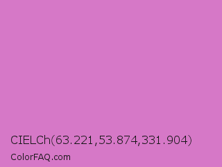CIELCh 63.221,53.874,331.904 Color is a light magenta color and the nearest color is French Mauve #d473d4. Hex code #d678c7 and RGB value is rgb(214,120,199). In RGB color space, this color is composed of 84% red, 47% green, 78% blue, In CMYK color space, this color is composed of 0% cyan, 44% magenta, 7% yellow , 16% black , In HSL color space, this color has a hue angle of 310° , 53% saturation and 65% lightness.