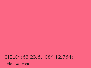 CIELCh 63.23,61.084,12.764 Color is a light red color and the nearest color is Ultra Red #fc6c85. Hex code #fc6684 and RGB value is rgb(252,102,132). In RGB color space, this color is composed of 99% red, 40% green, 52% blue, In CMYK color space, this color is composed of 0% cyan, 60% magenta, 48% yellow , 1% black , In HSL color space, this color has a hue angle of 348° , 96% saturation and 69% lightness.